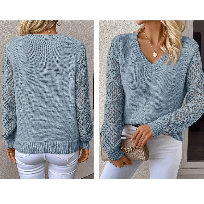 V Neck Pointelle Knit Sleeve Contrasted Sweater