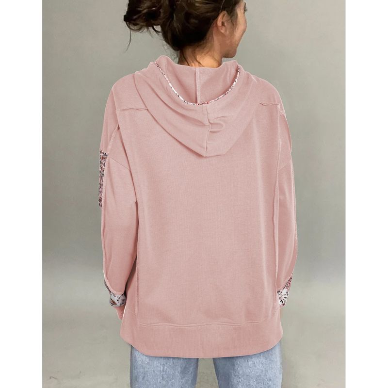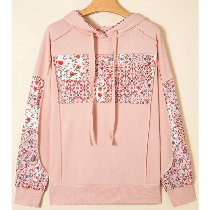 Mix floral patchwork design adds playful boho vibes to your look. Adjustable drawstring hood keeps this floral hoodie practical. Casual patchwork hoodie with side slit details. Material: 65%Polyester+35%Cotton