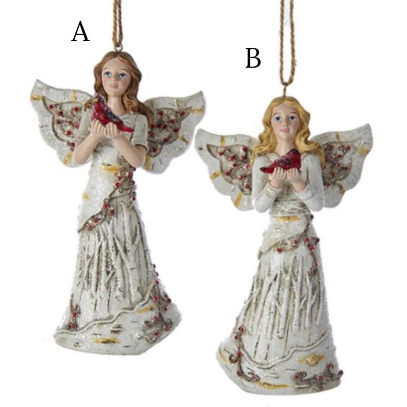These birch berries angel holding cardinal ornaments are a beautiful addition to any holiday décor or Christmas tree. This assortment of ornaments features one blonde and one brunette angel with gorgeous accents on their hair. Each of the angels are shown holding a red cardinal in their hands.